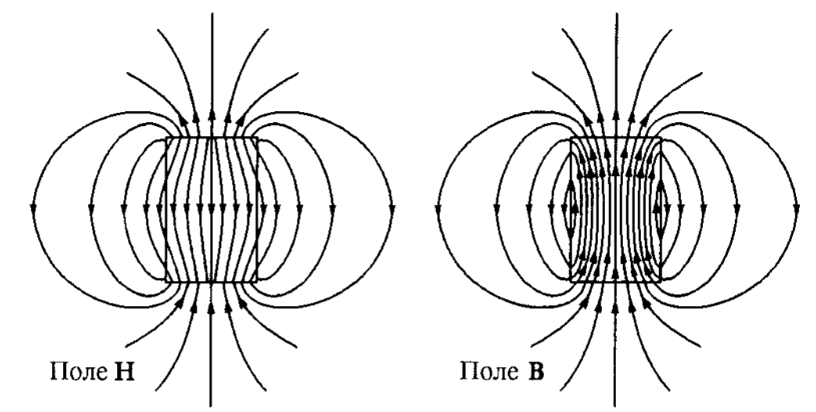 Как описать магнитное поле внутри магнетика? Понятно, что в магнетике силовые линии магнитного поля сгущаются, причём общая форма этих линий внутри магнетика несильно отличается от силовых линий в этой же окрестности в вакууме. Для примерного понимания прикрепляю картинку: