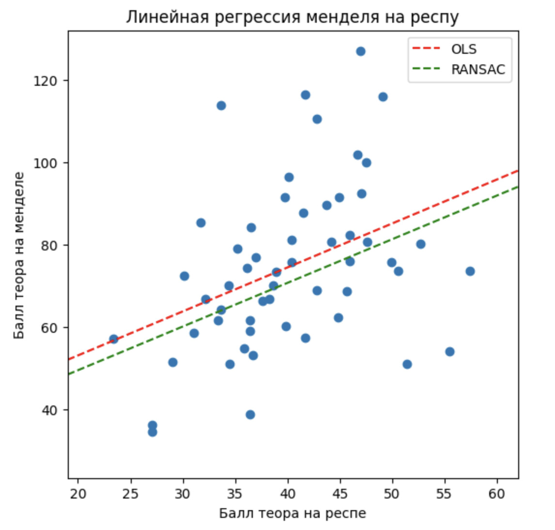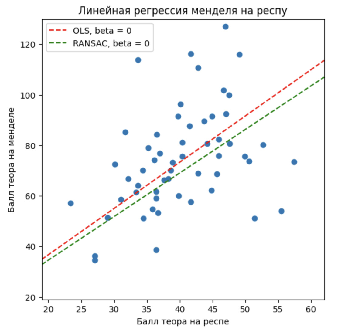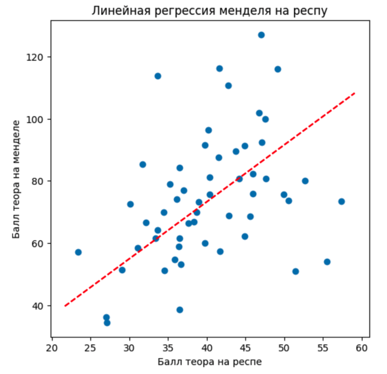 На мой взгляд, визуально the best fit line довольно хорошо проходится по данным. Конечно, мы видим, что много точек не проходят идеально по линии. Тут нужно остановиться и вспомнить, что результат на олимпиаде зависит от десятков факторов. И это удивительно, что результат на респе может иметь линейную зависимость(конечно в очень сильном приближении) от результата на Менделе. Как минимум, для бОльшего количество участников. Давайте, теперь с цифрами. В первом приближении результат Менделя (Y) зависит от балла на Респе (X) линейно: