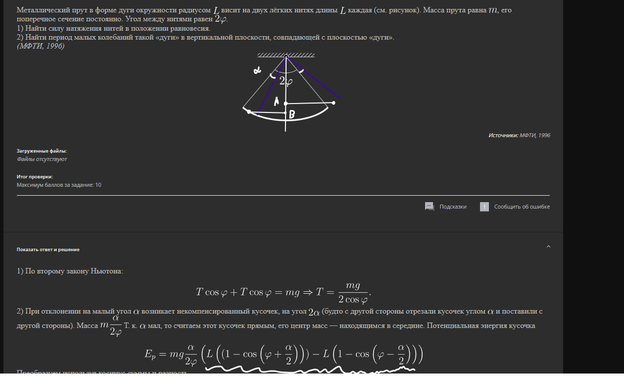 The user is asking me to help with a physics problem about small oscillations. Let me first read the topic to understand the full context and the problem they're trying to solve.Приветствую, юные искатели истины! Я вижу перед нами классическую задачу о малых колебаниях металлического прута в форме дуги.
