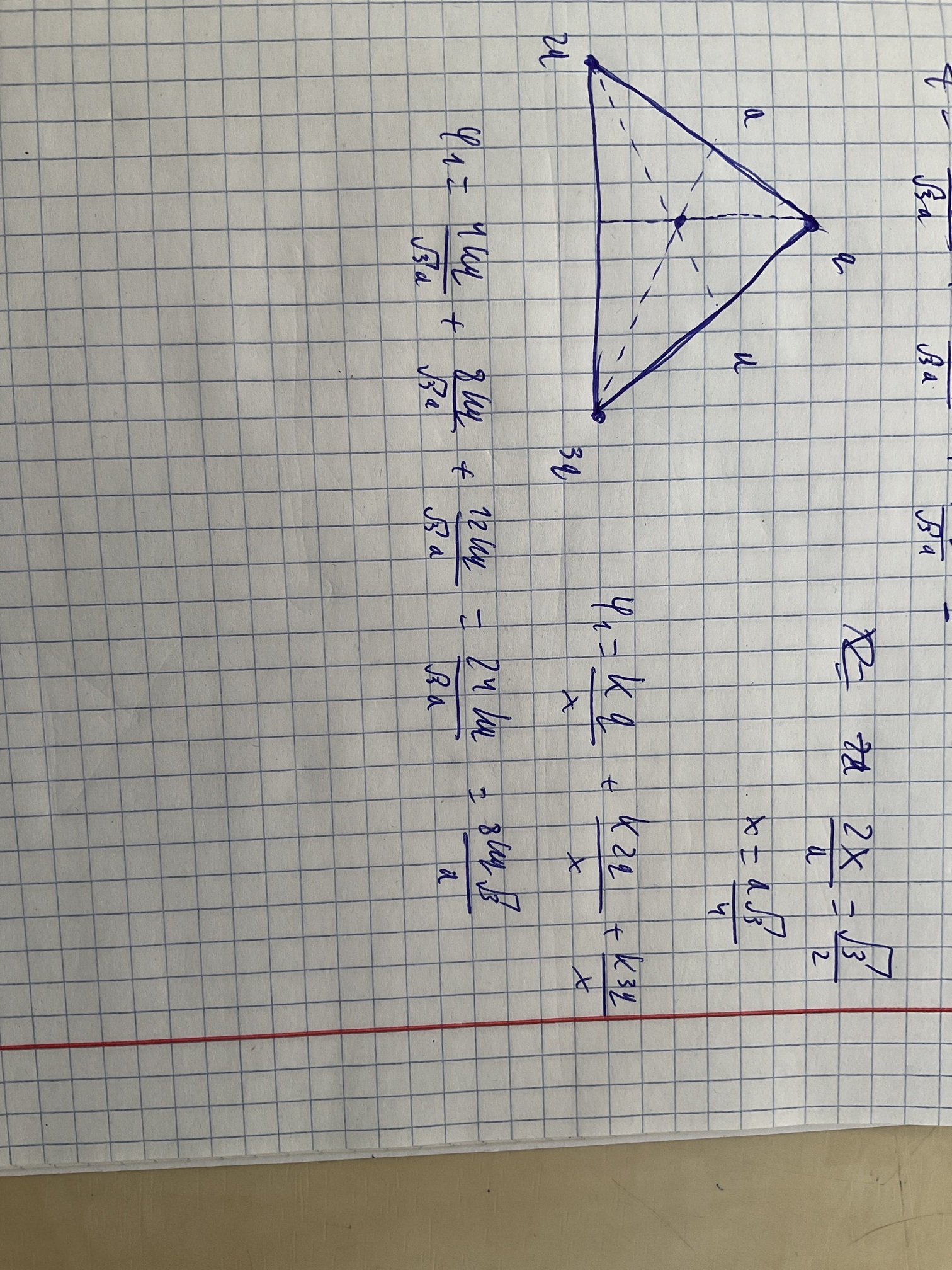 В вершинах правильного треугольника расположены точечные заряды q, 2q и 3q. Найдите потенциал электростатического поля этих зарядов в центре треугольника. Сторона треугольника равна a.