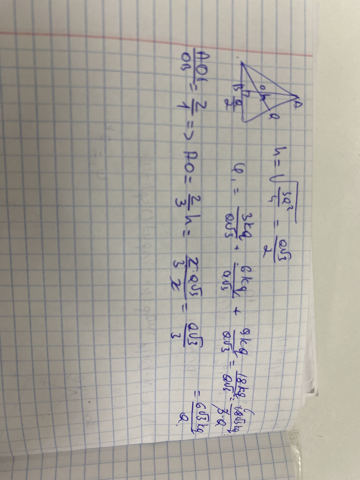 Медиана делится точкой О в отношении 2:1, тогда вся медиана состоит из 3-х частей, где расстояние от центра до заряда - это 2/3 этой длины