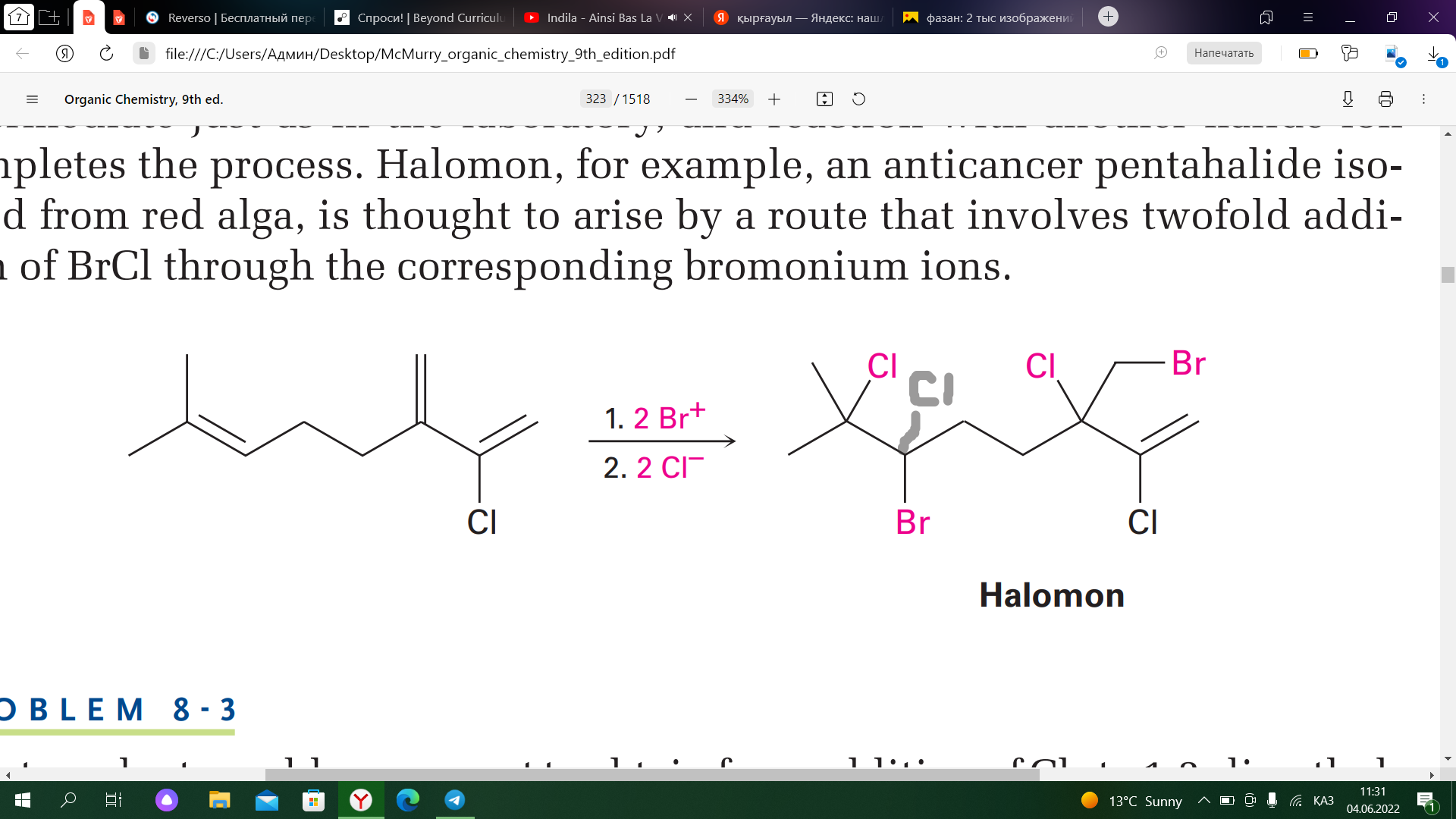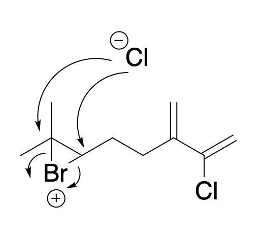 легкий вопрос но все же когда бром атакует углерод углерод становиться карбокатионом но здесь обе углерода (слева) будут трехзамешенными но почему хлор не может присоеденеиться к углероду где есть бром или это из за электроотрицательности и 2 галогенида будут хотеть намного дальше расположиться друг от друга и хлор присоеденяется к другому карбону можете обьяснить причину того что хлор не может соедениться с карбоном который имеет связь с бромом?