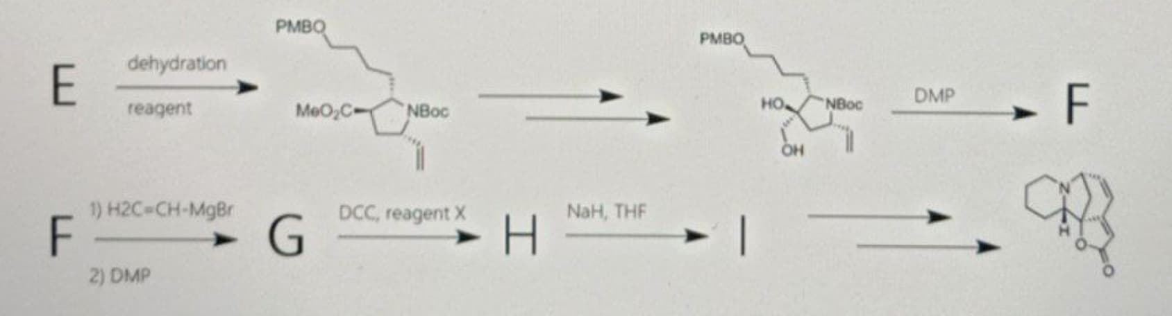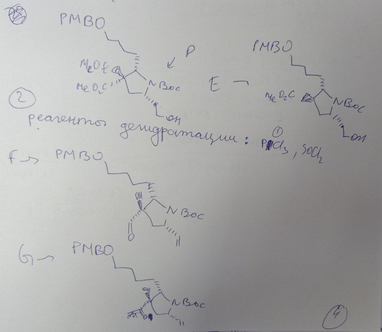 В целевой молекуле мы видим наш старый пятичленный цикл. Также азот стоит внутри другого 6-членного цикла. Могу предположить что этот цикл образовался при атаке азота на углерод который держит OPMB. Теперь надо подумать какую кислоту надо добавить к третичному гидроксилу чтобы, чтобы полученный эфир еще и реагировал с тем кетоном с образованием нужной нам целевой молекулы).