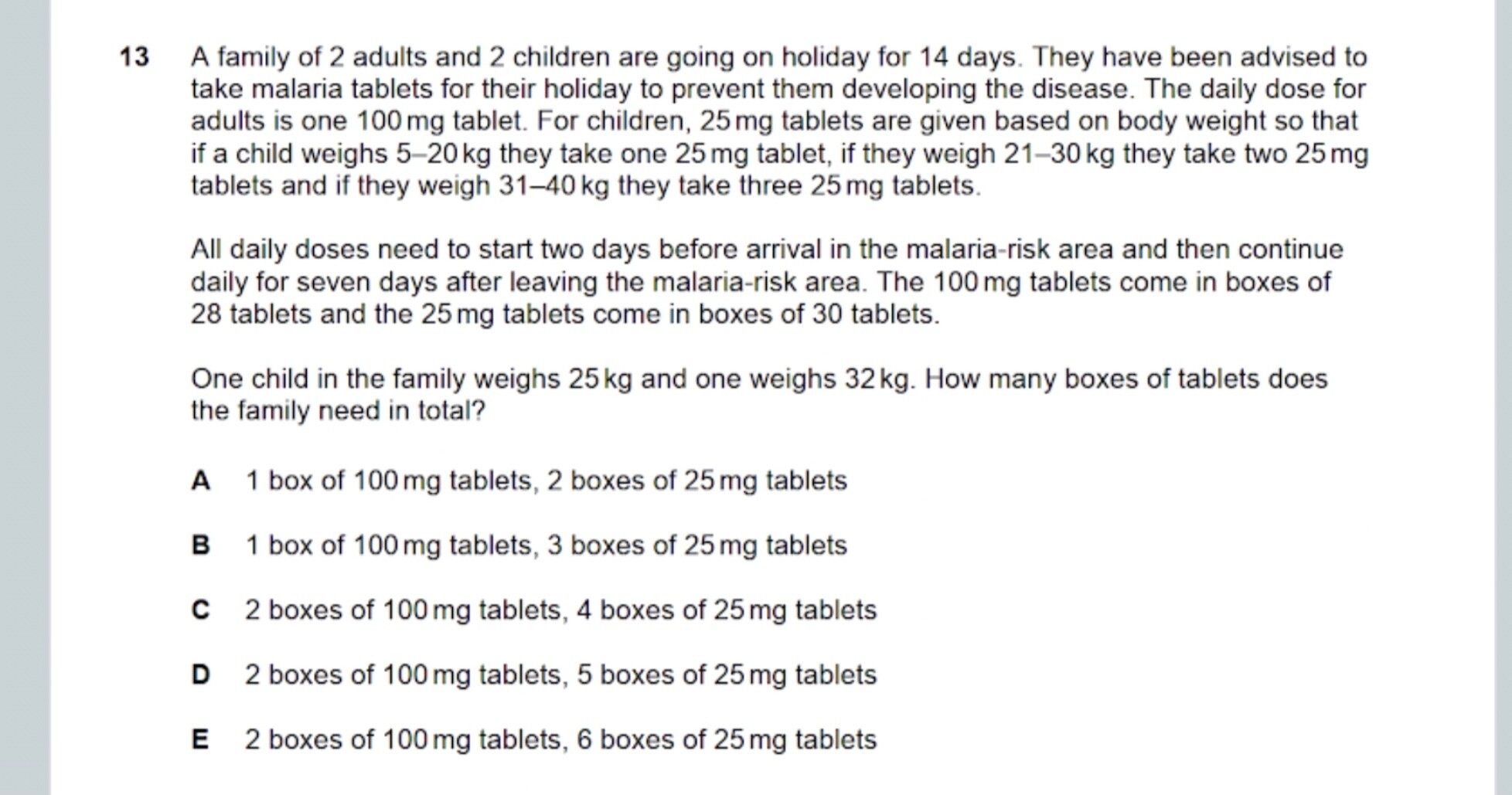 Но после того, как я это все выписал, мне теперь стало казаться, что они имеют ввиду так: ежедневные дозы должны начаться за два дня до входа в зону риска, а продолжиться они должны не сразу, а после выхода из зоны риска. При этом продолжаться они будут в течении 7 дней. Тогда в общем надо 8 доз, что намекает на то, что ответ А верный (хотя бы 2 \times 8 = 16 таблеток взрослым и хотя бы (2 + 3) \times 8 = 40 таблеток детям).