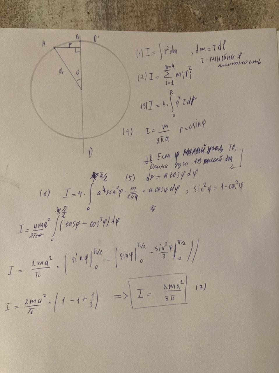Если центр окружности обозначим С-то момент инерции дуги с углом АСB=90 градусов равна последнему множителю в интеграле (3) И дальше нашел момент инерции окружности умножив на 4 полученный интеграл.