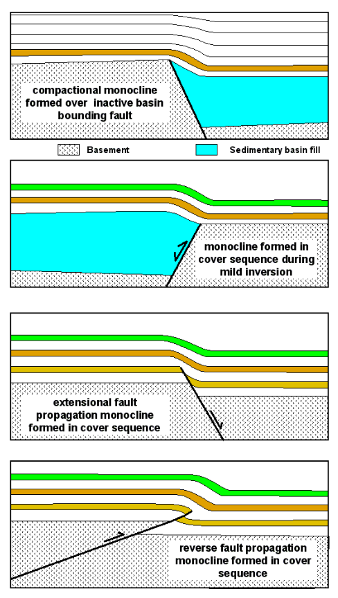 Изображение больше напоминает сброс (normal fault), но оба так или иначе могут привести к формированию моноклиналей. Неровность, возникающая из разлома, выражается через складчатость, и так как при взбросах (reverse faults), участок коры поднимается относительно подошвы, выступающий участок порождает моноклин.