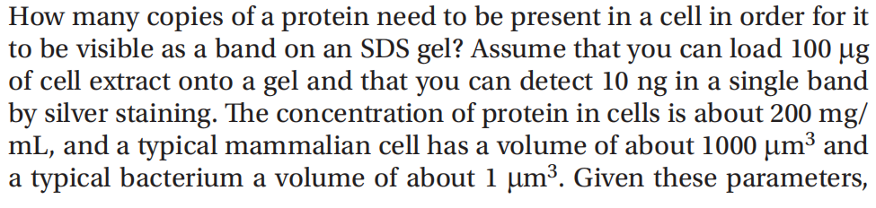 Скорее всего так и есть иначе непонятно почему дана масса клеточного экстракта. Тогда правильный ответ 10^8 копий белка в клетках млекопитающих и 10^5 копий белка в бактериальных клетках.