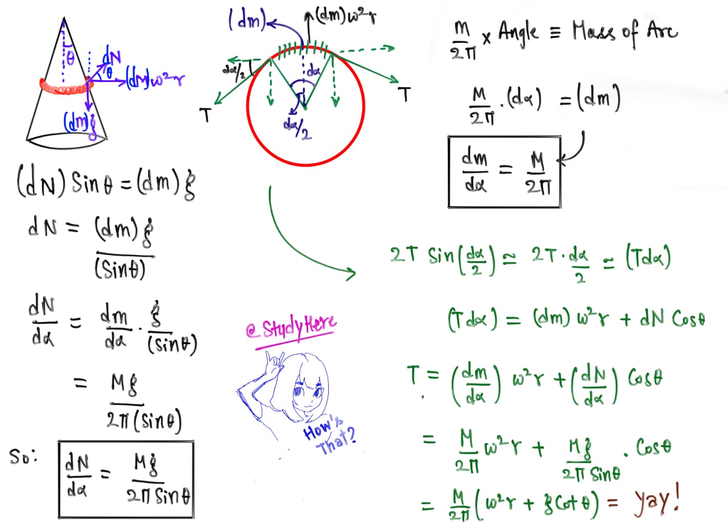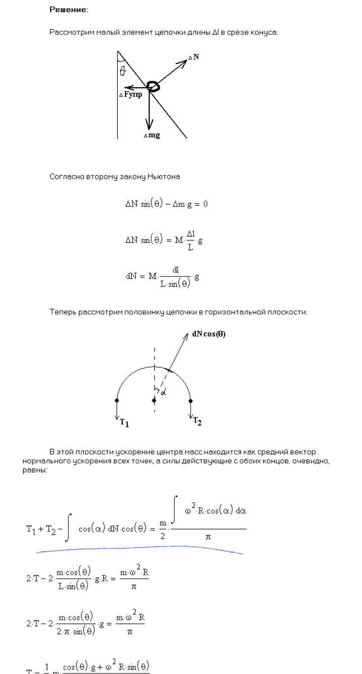 Цепочка массы m, образующая окружность радиуса R, надета на гладкий круговой конус с углом полураствора ϑ. Найти натяжение цепочки, если она вращается с постоянной угловой скоростью ω вокруг вертикальной оси, совпадающей с осью симметрии конуса