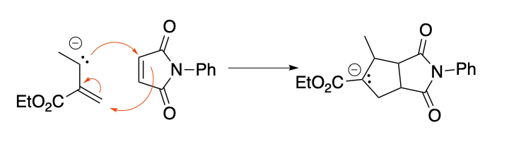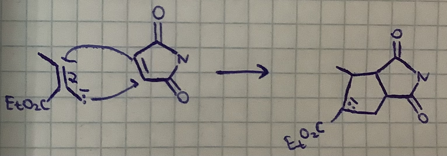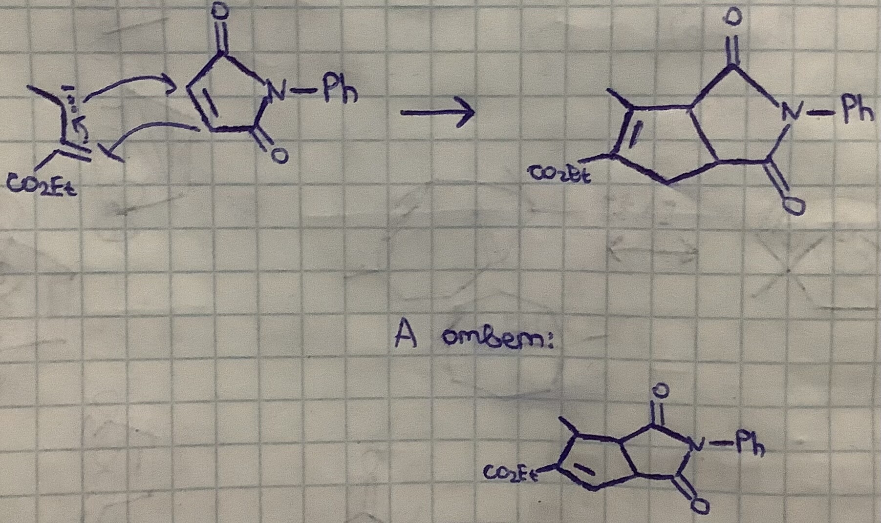 Молекула, выступающая в роли “2” в циклоприсоединении понятна – это имидомалеат (или как там его зовут? пирролдион какой-нибудь?). В общем, вы поняли. Значит в роли “3” или “4” должна выступать молекула O. Исходя из структуры Р, легко предположить, что “3” (а он кстати должен быть ионом) будет иметь такую структуру: