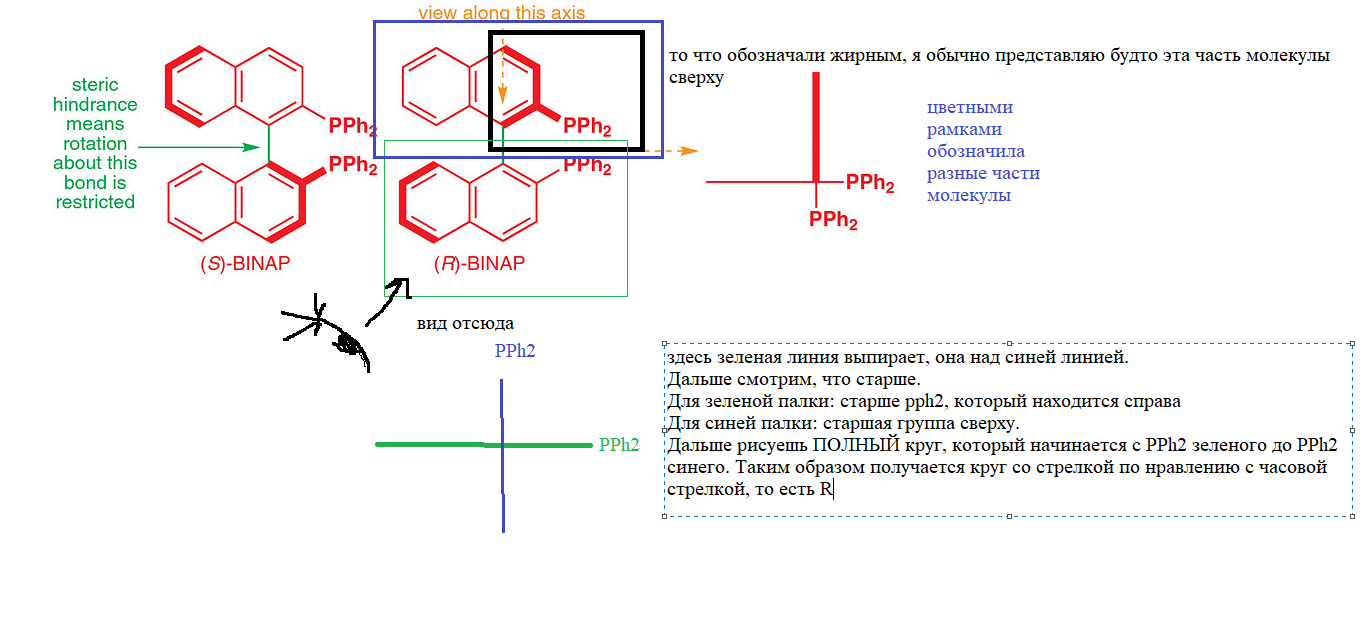зеленый PPh2 → синяя палка → зеленая палка → синий PPh2, получается R. Здесь начало и конец должны быть старшими группами каждой линии. Определяешь старшую группу зеленой палки, дальше синей группы, и эти фрагменты являются началом и концом.