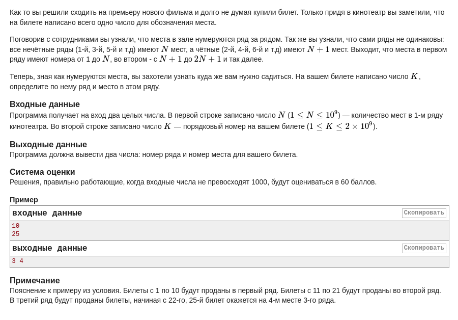 Вижу, что основная сложность задачи заключается в правильном определении ряда и места по порядковому номеру билета K, учитывая чередование рядов с N и N+1 местами.