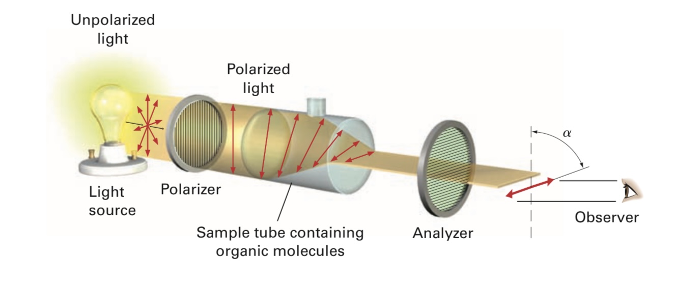 Я не совсем понимаю действие органических молекул, но, судя по всему, электромагнитная волна становится поляризованной по правому кругу, а плоскость поляризации (плоскость, в которую на данный момент направлен электрический вектор) вращается с угловой скоростью \omega = ck (k – волновое число в данной среде). На выходе это направление впоследствии (опять же, судя по рисунку) не меняется, и направлено под углом \alpha к горизонтальной плоскости. Можно посчитать время \tau, которое электромагнитная волна провела внутри этой трубки, в таком случае \omega\tau = \alpha + \pi n.