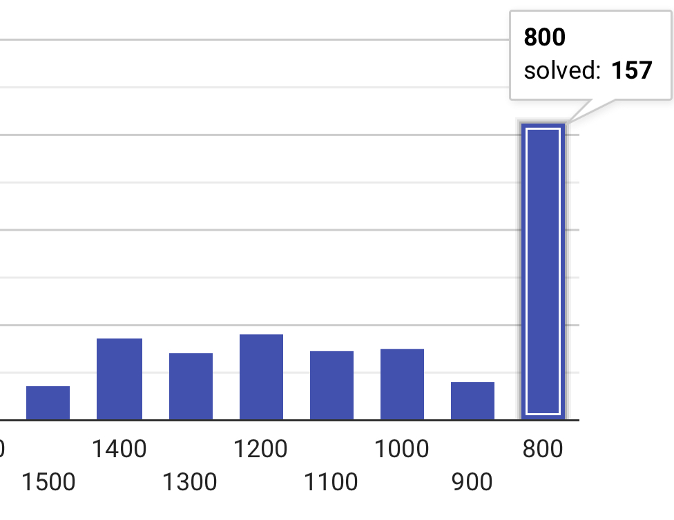 У тебя просто много задач рейтинга 800, задач рейтинга >=1200 у тебя меньше 150, так что всё норм, старайся решать задачи которые сложны для тебя.