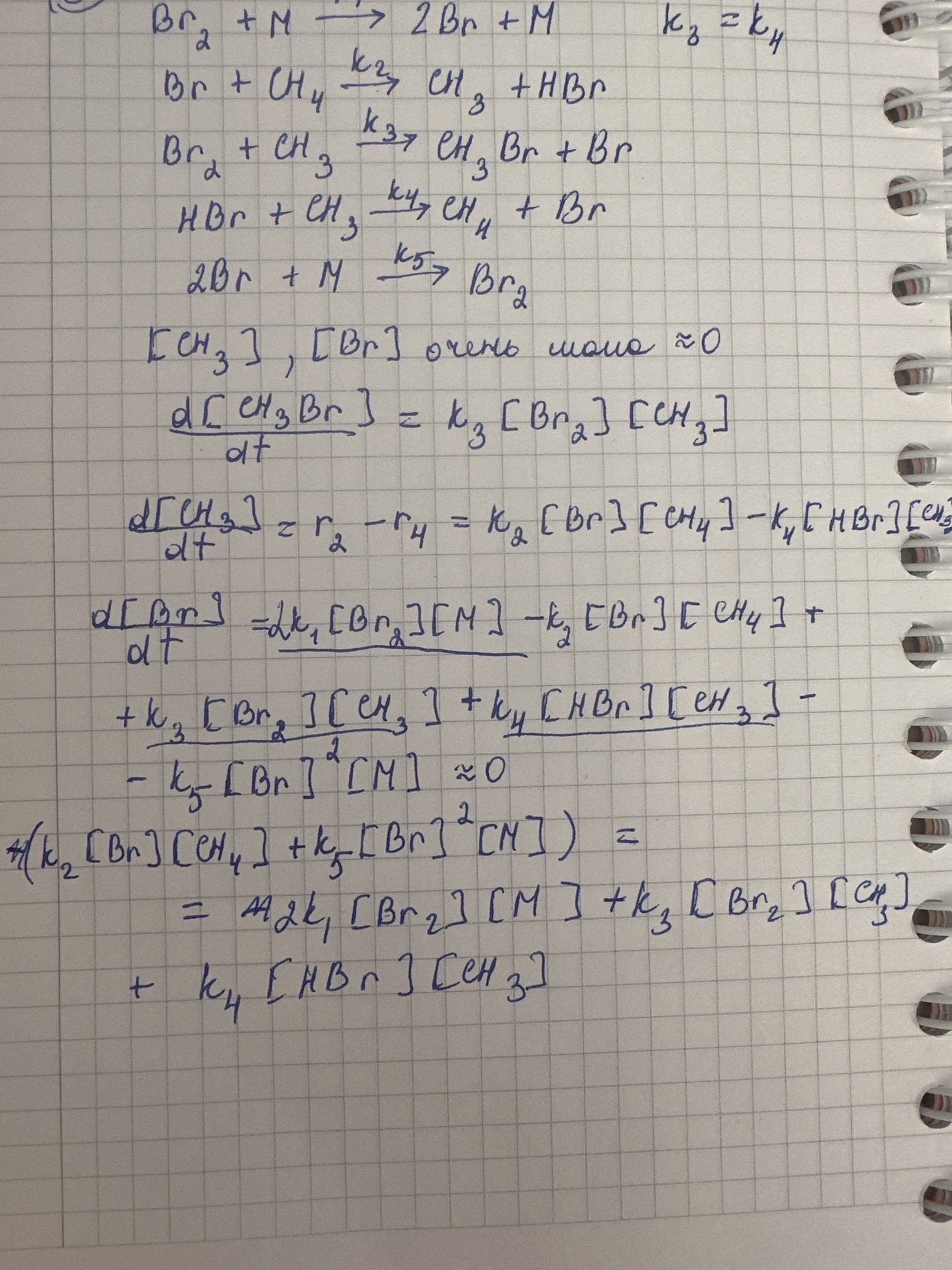 Ты забыла двойку перед k_5[\cdot\ce{Br}][\ce{M}] (мы ведь рассматриваем скорость изменения концентрации бром-радикала).