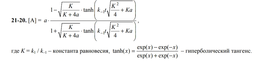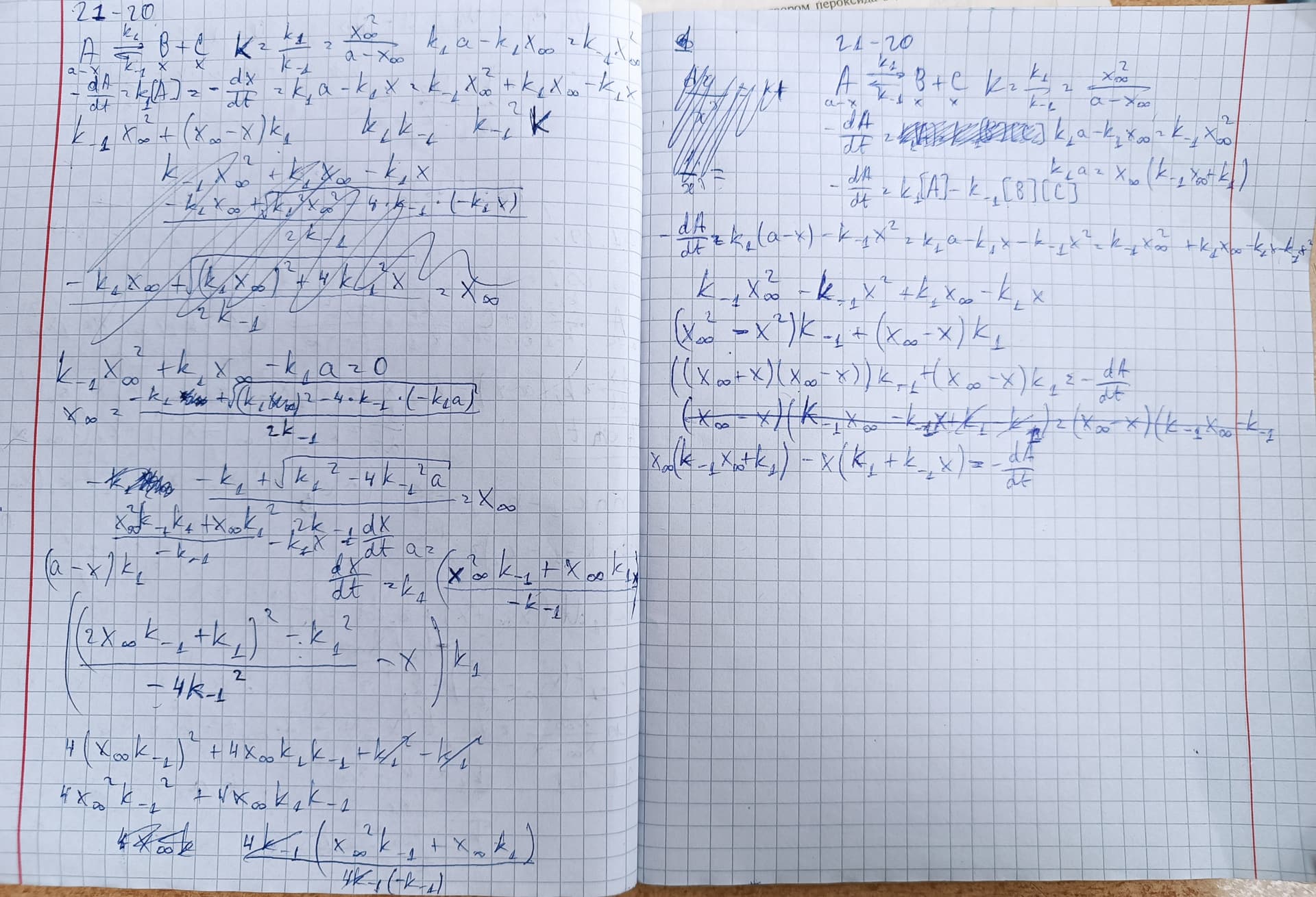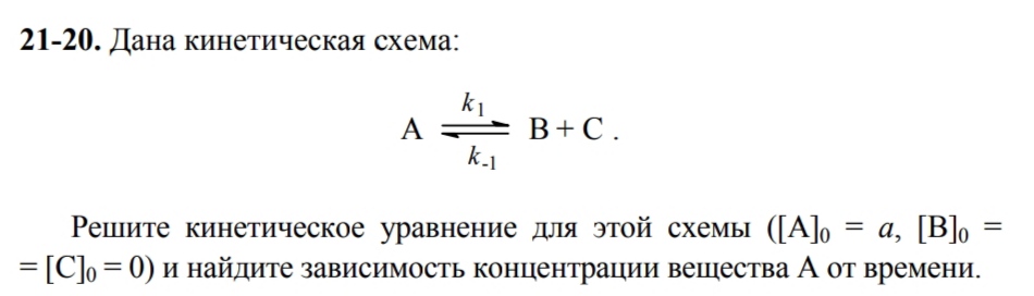 Прошу помочь с решением задачи. Сначала попробовал сам решить, но ничего вообще не получалось. Потом решил посмотреть ответ, и он ни разу не совпадал с моими ожиданиями. В общем, пытался я решить это обычным методом вывода обратных реакции, то есть скорость расходования вещества А выразил с помощью констант скорости реакции (-dA/dt=k1[A]-k-1[B][C]), потом равновесную концентрацию А я взял как а-х, а концентрации B и C как х. Ещё выразил константу равновесия как k1/k-1 и это равно ²/a- ([х] - равновесный х). После этого у меня получилось k1a=k-1²+k1. Потом я подставил k1a в уравнение выше (-dA/dt=k1[A]-k-1[B][C]). Дальше я ничего не смог сделать. Поначалу я все же пытался выводить х и [х] за скобки, но у меня это не получилось. Может быть у этой задачи какой то другой вывод?