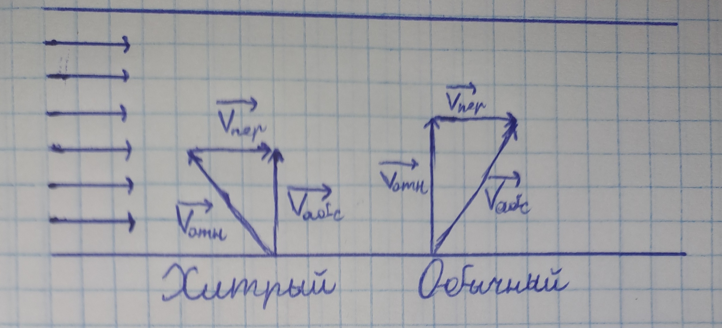 Хитрый пловец учитывает течение реки и использует его. Относительно воды он может выбрать угловую траекторию, чтобы управлять своим движением. Это позволяет ему направляться прямо к точке Б на берегу, хотя его движение относительно воды может выглядеть не прямым.