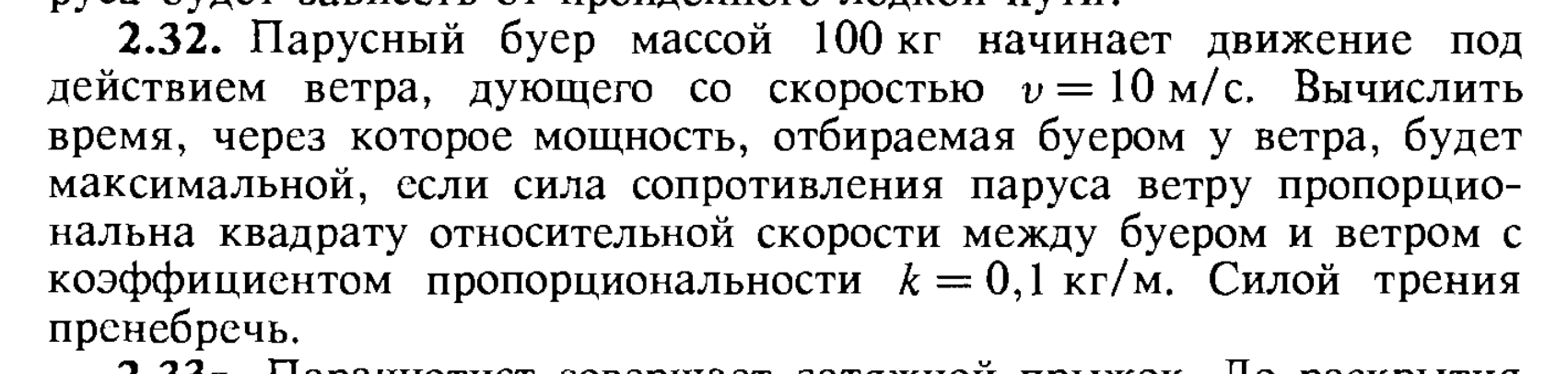 2.32. Парусный буер массой 100 кг начинает движение под действием ветра, дующего со скоростью г = 10 м/с. Вычислить время, через которое мощность, отбираемая буером у ветра, будет максимальной, если сила сопротивления паруса ветру пропорциональна квадрату относительной скорости между буером и ветром с коэффициент пропорциональности k=0.1