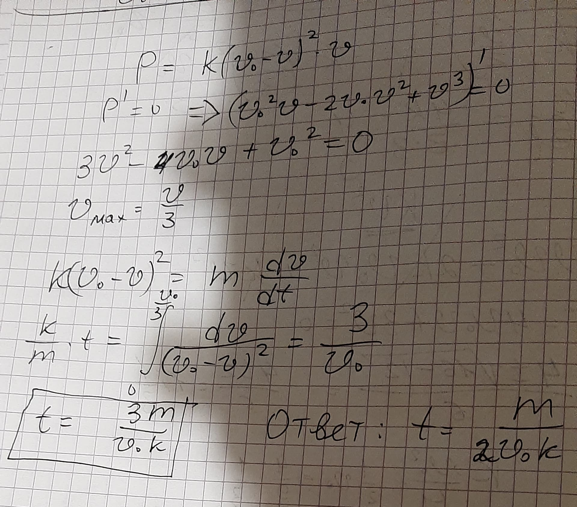 Нашел скорость, при которой мощность максимальная, потом проинтегрировал и посчитал время. Можете указать, где я ошибся?