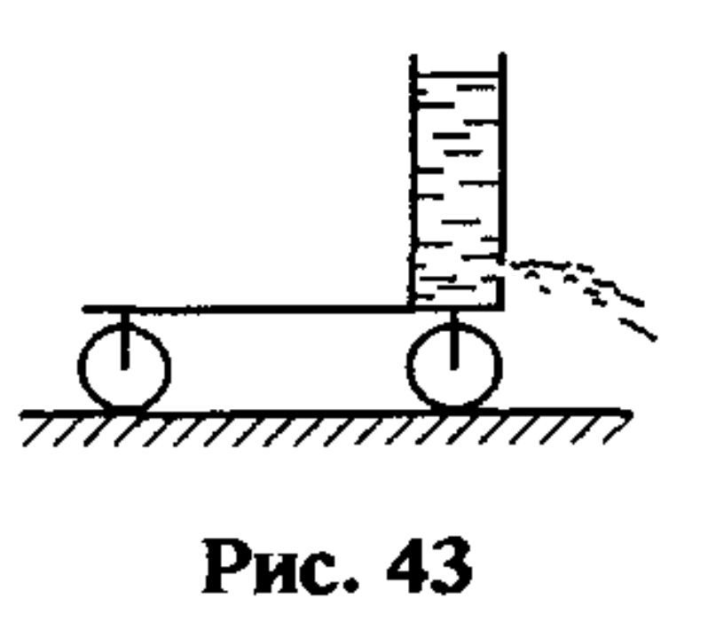 3.12. На краю массивной тележки (рис. 43), покоящейся на горизонтальной плоскости, укреплен цилиндрический сосуд радиуса r и высоты H, в нижней части которого имеется небольшое отверстие с пробкой. Сосуд наполнен жидкостью плотности р. В момент времени t = 0 пробку вынимают.Найти максимальную скорость, которую приобретает тележка, считая, что H>>r и M>>{\rho}r^2{\pi}H, где М масса тележки с сосудом. Пояснить смысл этих ограничений. Трением в подшипниках тележки, трением качения и внутренним трением жидкости пренебречь.