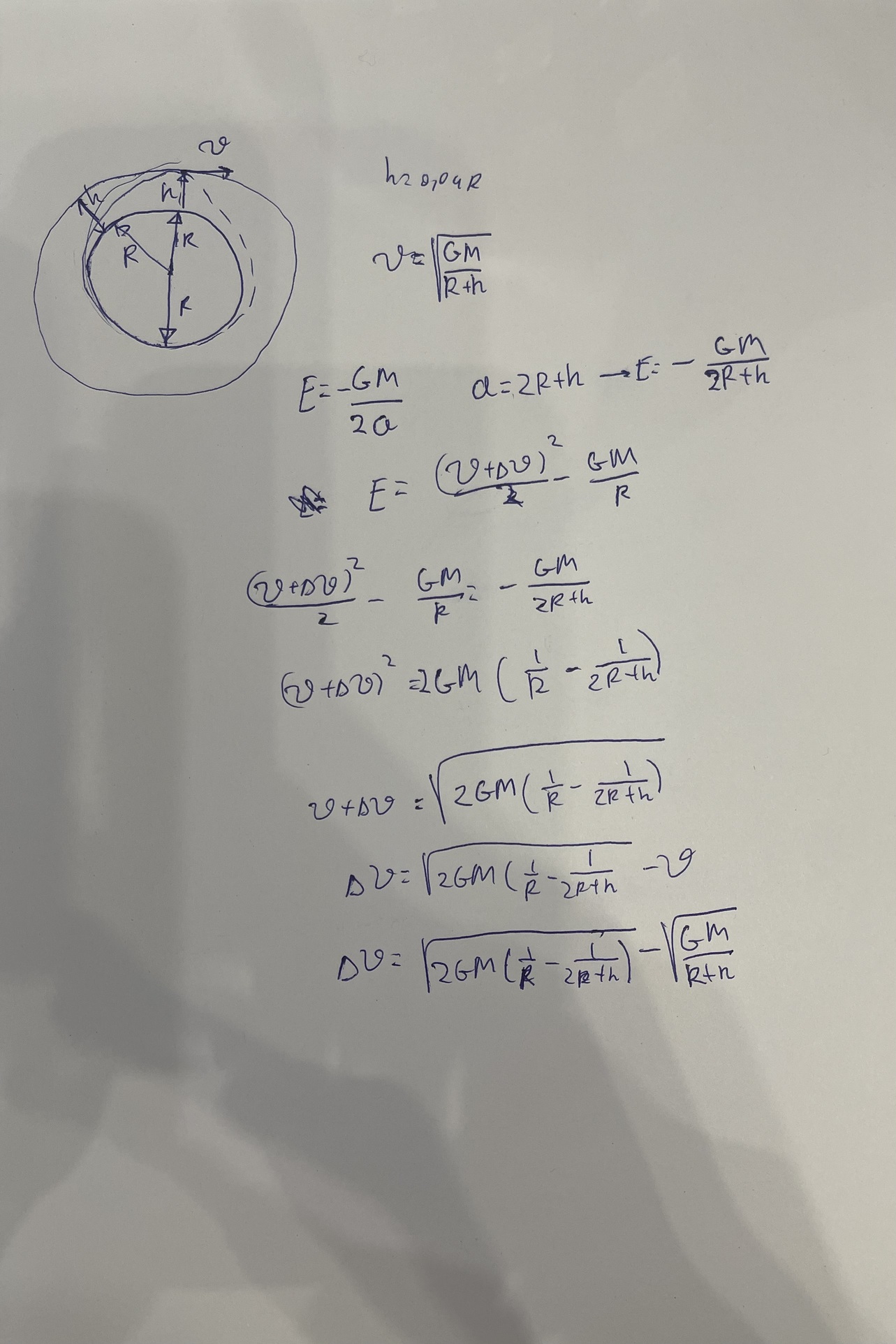 - На спутнике, который движется по круговой орбите на высоте 0,04 радиуса Земли от ее поверхности, включается тормозной двигатель. Скорость спутника падает, но не изменяется по направ-лению. Рассчитать минимальное уменьшение скорости, необходимое для того, чтобы спутник, перейдя на эллиптическую орбиту, опустил-ся на Землю. Торможением в атмосфере пренебречь. Время работы двигателя считать малым по сравнению с периодом обращения спутника вокруг Земли.