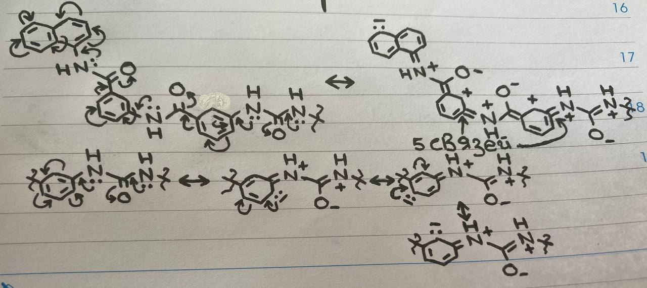 Чё-та написать непрерывную пи сопряженную систему реально не получается, выходит что на углеродах 5 связей, получается только то что мочевина создаёт сопряженную пи систему с бензольными кольцами и дальше не идёт: