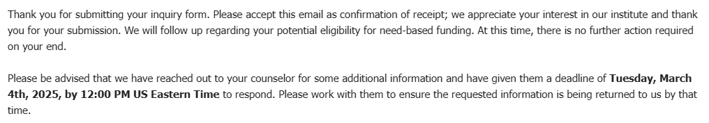 Приняли на программу Pioneer Academics. Только без финансирования(conditionally admitted). Ранее отправляла заявку на financial aid, но мне отказали потому что не состою ни в каких нон-профит организациях. Мне нужно отправить им ответ до 7 мая, кто знает где найти финансирование или как сам admissions commission упросить? У меня нет возможности платить 7000$, честно говоря.