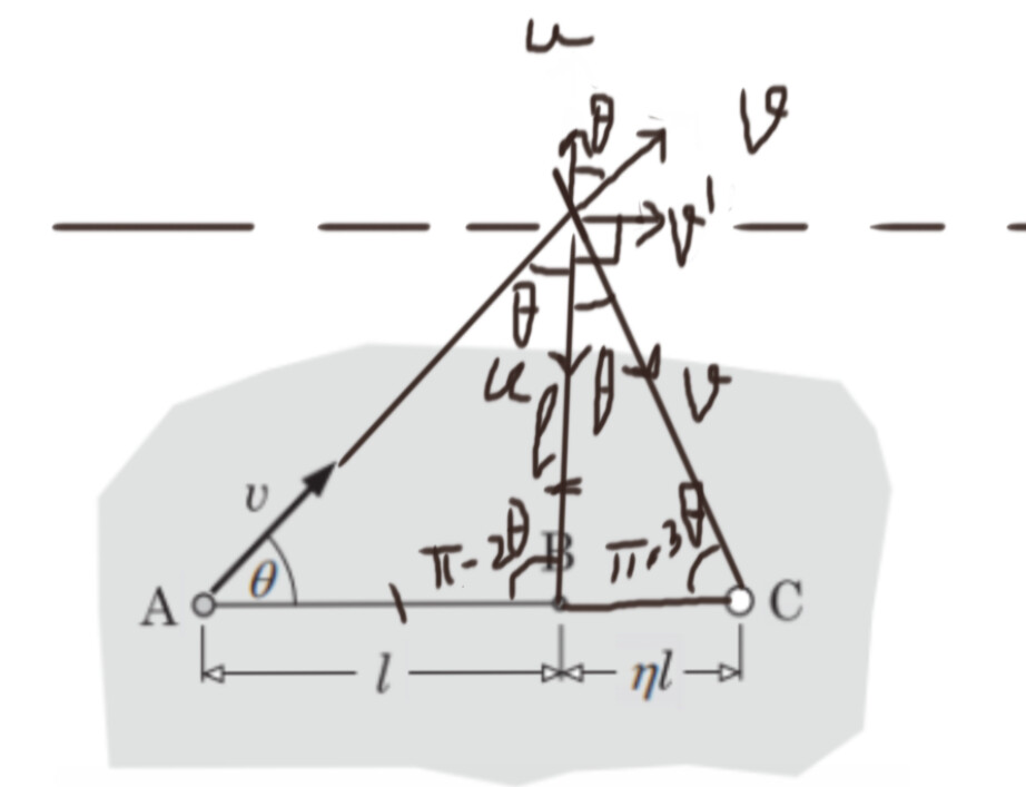 The main idea of solving the problem is that the energy is conserved and the speed will remain the same, for the time being, the length of the cord will also remain the same. Because of this, we can use geometry. We will have several triangles: