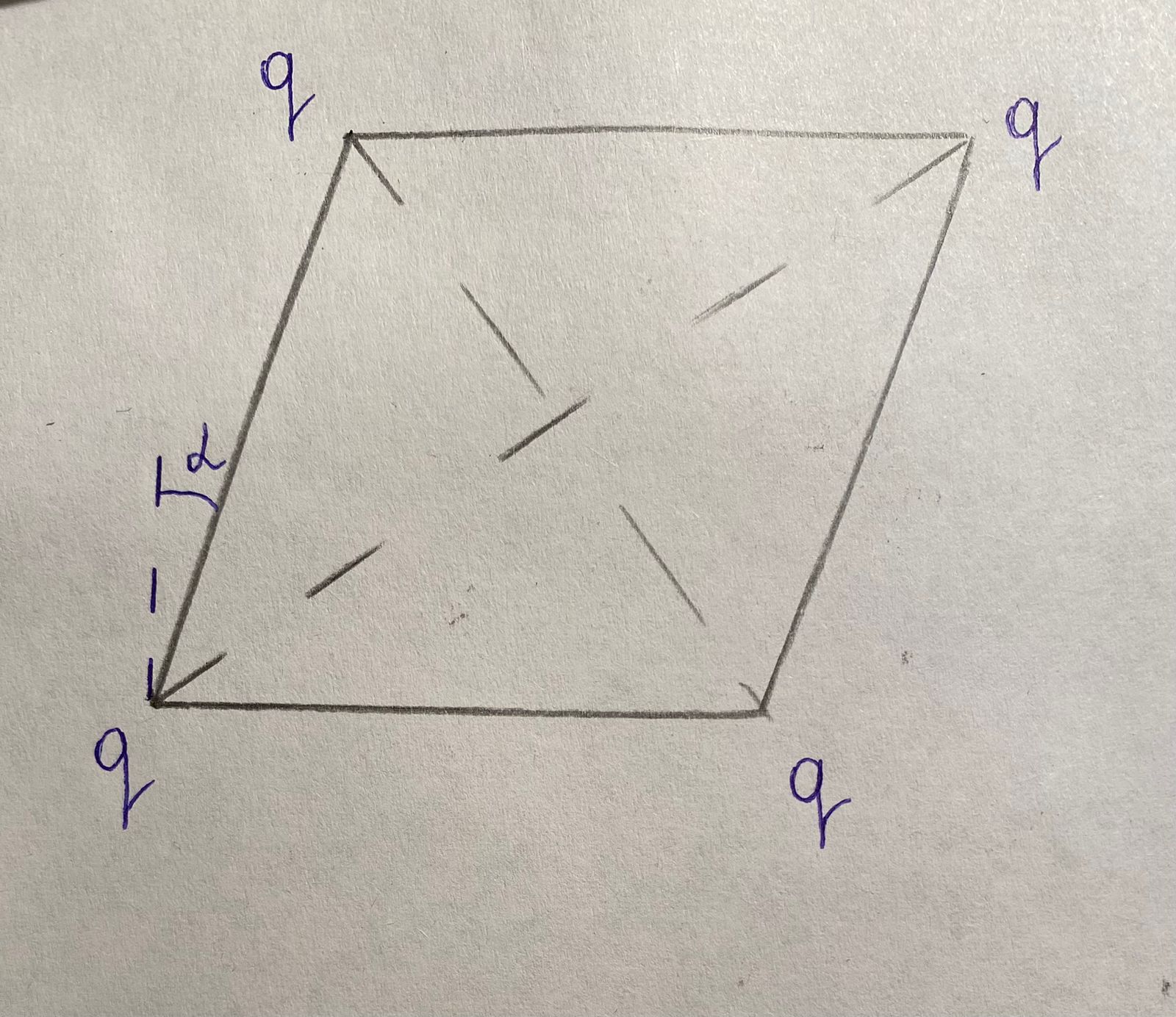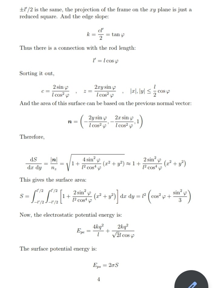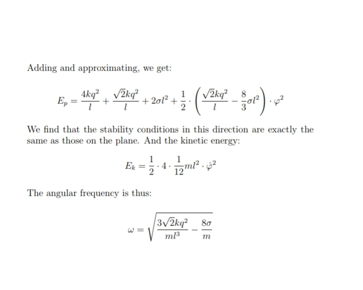 \displaystyle \delta E_e = \frac{kq^2}{\sqrt{2}l} \left( \frac{1}{1-\sin(\frac{\alpha}{2})} + \frac{1}{1+\sin(\frac{\alpha}{2})} -2\right) \thickapprox \frac{kq^2}{2 \sqrt{2}l}\alpha^2