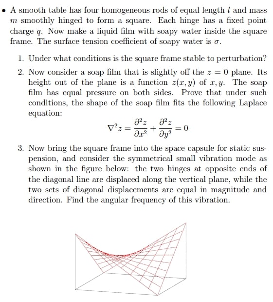 Then they must have considered perturbations in 3 dimensions for the 1 part. I assumed that they meant perturbations in 2D because motion and shape of frame in 3D is analyzed in parts 2 and 3. I think that finding conditions for stable perturbations in part 1 makes no sense because it requires you to already know the z(x, y) and finding potential energy of the system, which makes parts 2 and 3 meaningless.