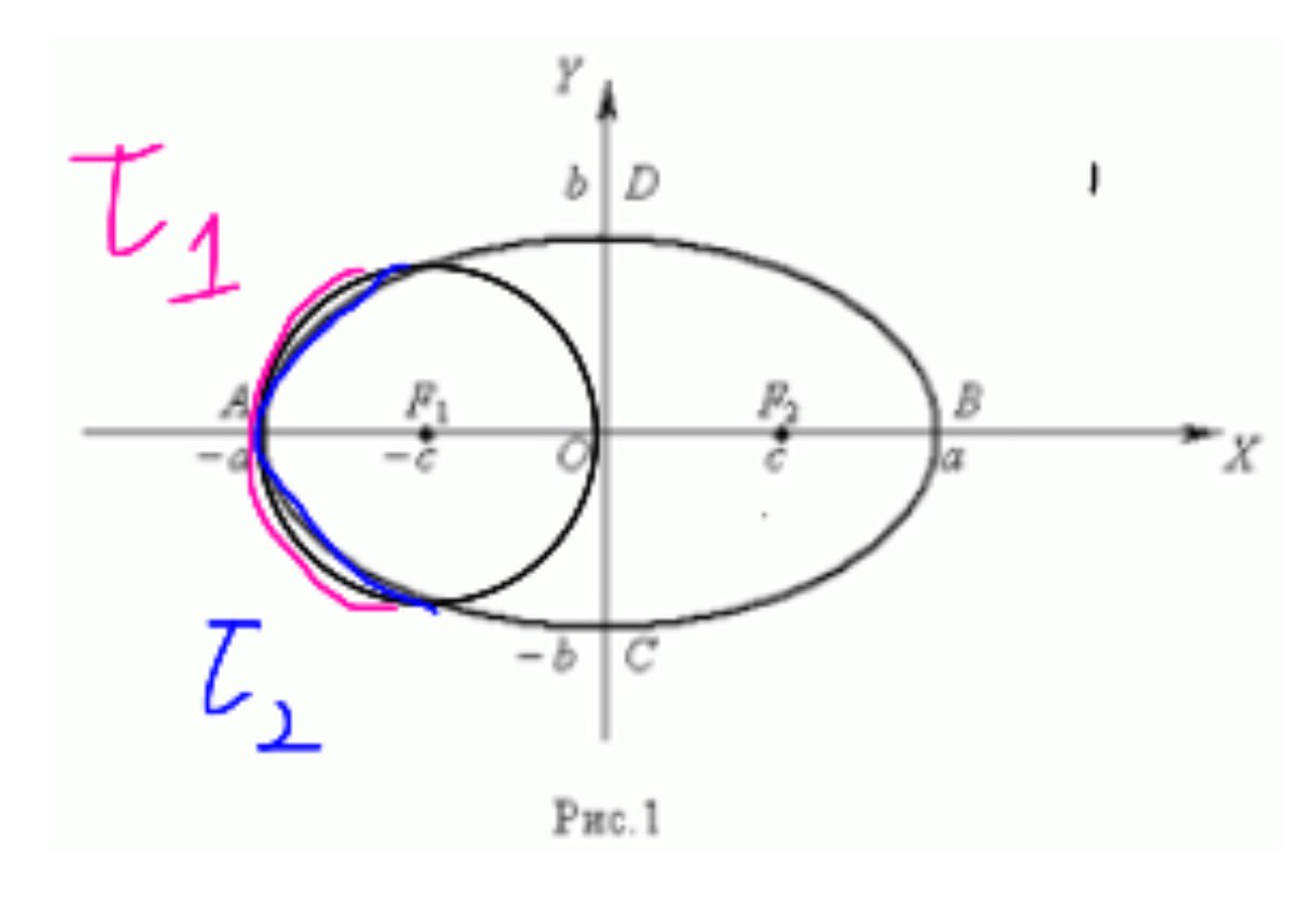 Да это правильно. Пусть угол между радиус векторами направленными от первого фокуса F_1 до точек пересечения эллипса с окружностью равен \theta. Тогда площадь окружности S_{окр.}=\frac{R^2\theta}{2}. Используя уравнение выше можно получить \frac{R^2\theta }{2}=\frac{L_1t_1}{2m_1}. Площадь сектора эллипса состоит из площади равнобедренного треугольника, бедрами которого являются два радиуса вектора от F_1 до точек пересечения эллипса с окружностью + площади сегмента между выпуклой частью эллипса и прямой, которая проходит через точки пересечения эллипса с окружностью.