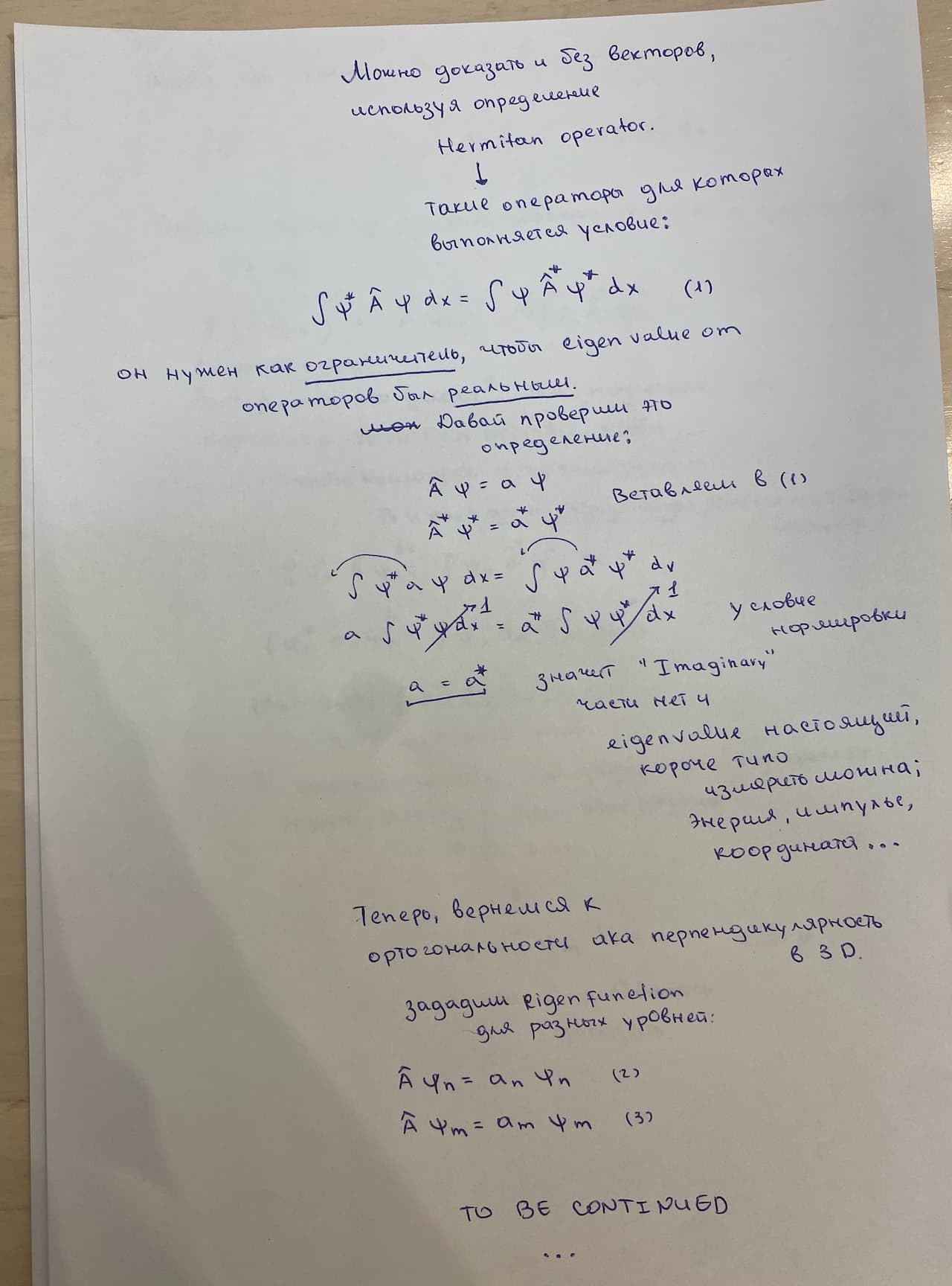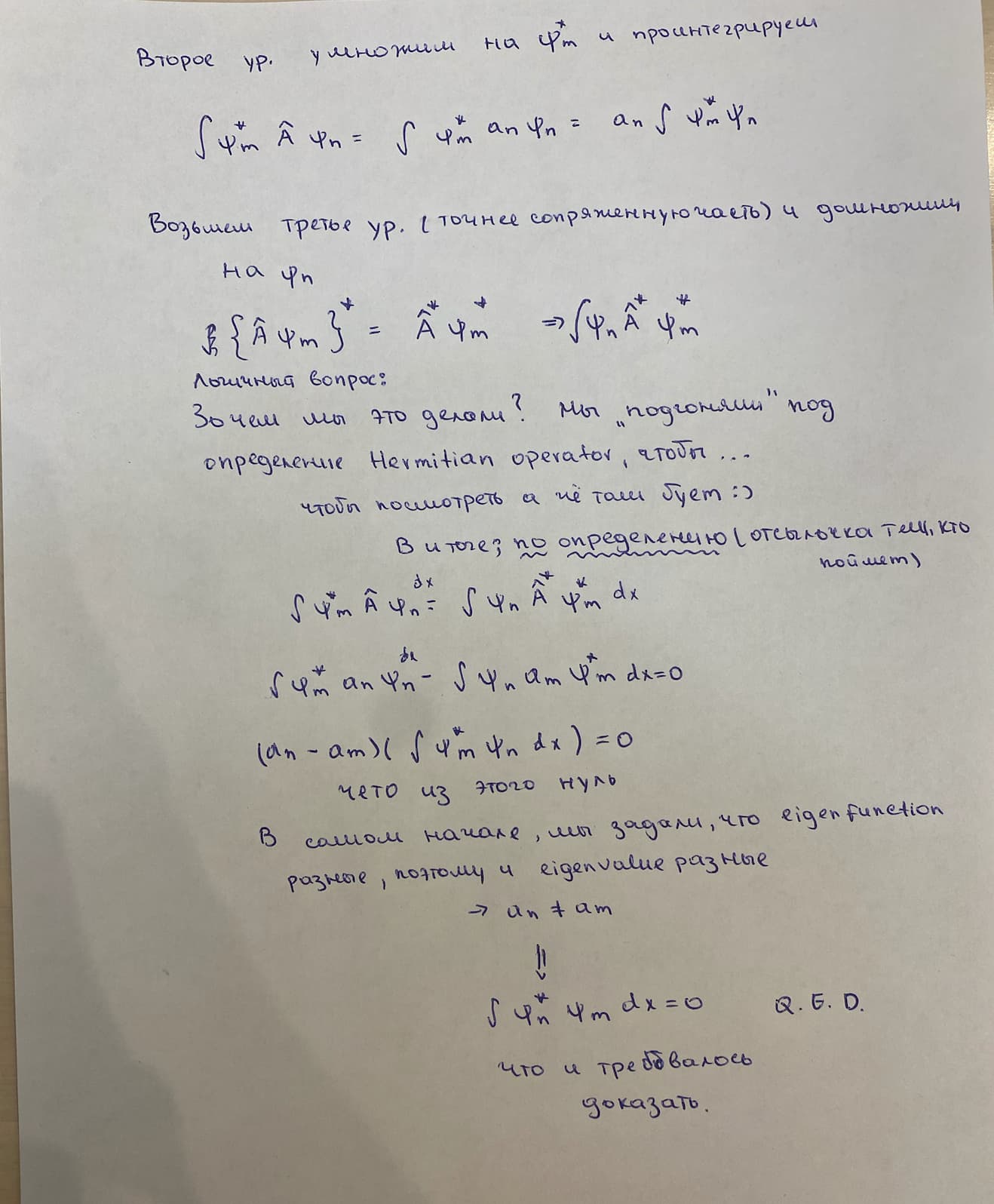 Ну вообще-то нет. То, что ты показал на втором скрине – то, что для эрмитовых операторов невырожденные айгенфункции имеют \int dx \psi^*_m \psi_n =0. Чтобы сказать, что они ортогональны, надо понимать, что \int dx \psi^*_m \psi_n =0 и есть математическое определение ортогональности (о чем, собственно, и вопрос автора).