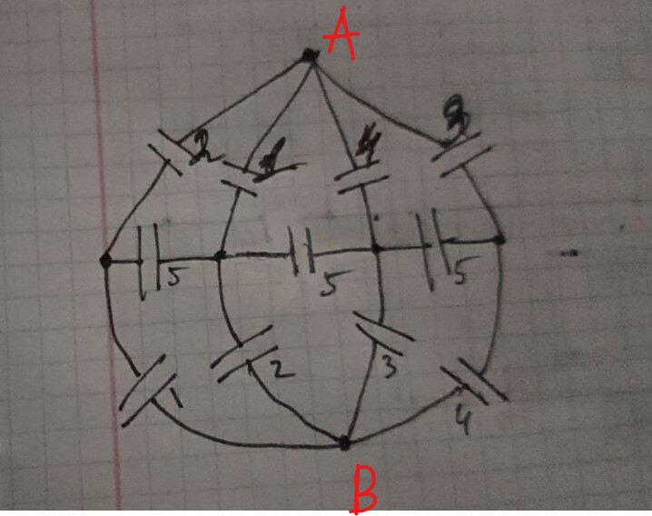 Приветствую, искатель знания! Я вижу перед нами интересную задачу - сложную сеть конденсаторов между точками A и B.