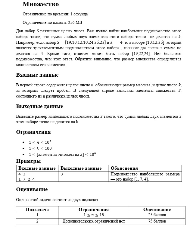 Возьмём числа по модулю, теперь если ты берешь x, то не можешь взять k-x, выбираешь жадно то, что больше. Если же x=k/2, то надо учесть, что больше 1 такого числа мы взять не можем.