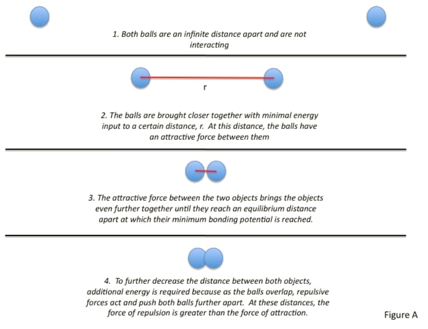 Imagine two rubber balls separated by a large distance. Both objects are far enough apart that they are not interacting. The two balls can be brought closer together with minimal energy, allowing interaction. The balls can continuously be brought closer together until they are touching. At this point, it becomes difficult to further decrease the distance between the two balls. In order to bring the balls any closer together, increasing amounts of energy must be added. This is because eventually, as the balls begin to invade each other’s space, they repel each other; the force of repulsion is far greater than the force of attraction.