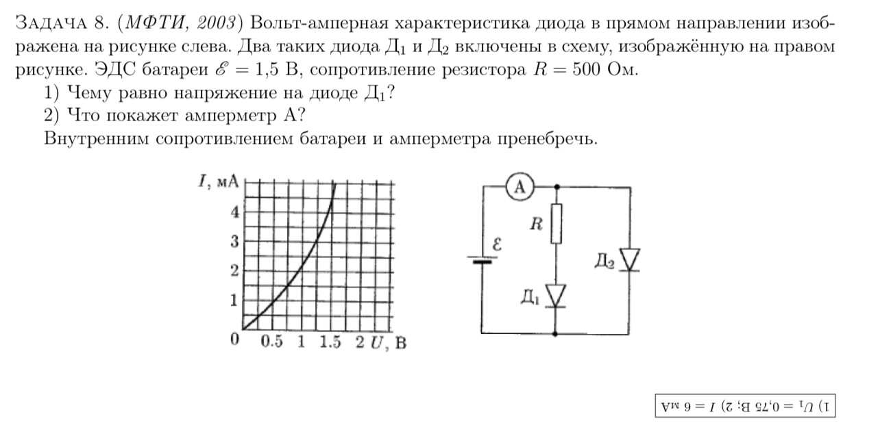 Задача 8. (МФТИ, 2003) Вольт-амперная характеристика диода в прямом направлении изображена на рисунке слева. Два таких диода Д_1 и Д_2 включены в схему, изображенную на правом рисунке. ЭДС батереи 1,5 В, сопротивление резистора R=500 Ом.