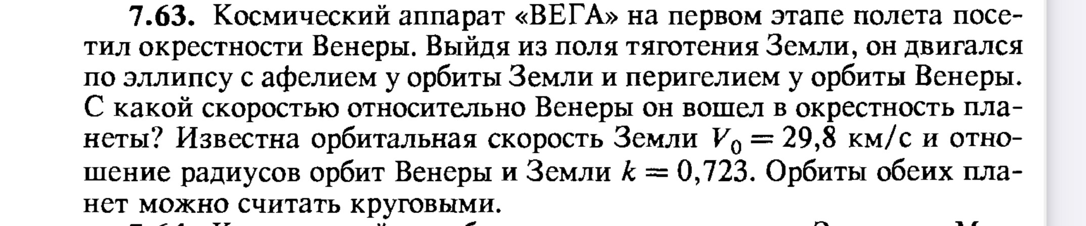 7.63. Космический аппарат “ВЕГА” на первом этапе поёта посетил окрестности Венеры. Выйдя из поля тяготения Земли, он двигался по эллипсу с афелием у орбиты Земли и перигелием у орбиты Венеры. С какой скоростью относительно Венеры он вошёл в окрестность планеты? Известна орбитальная скорость Земли V_0 = 29.8\ км/с и отношение радиусов орбит Венеры и Земли k = 0.723. Орбиты обеих планет можно считать круговыми