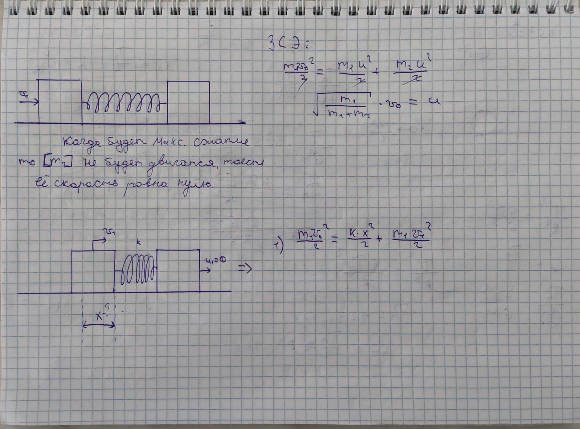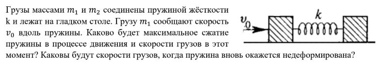 Грузы массами m_{1} и m_{2} соединены пружиной жёсткости к и лежат на гладком столе. Грузу m_{1} сообщают скорость v_{0} вдоль пружины. Каково будет максимальное сжатие пружины в процессе движения и скорости грузов в этот момент? Каковы будут скорости грузов, когда пружина вновь окажется недеформирована?