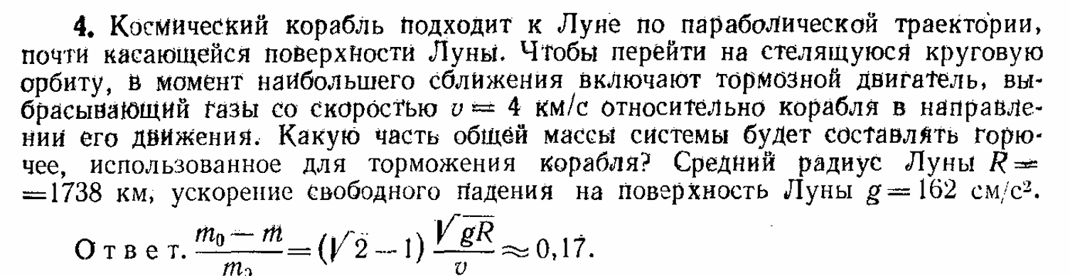 Космический корабль подходит к Луне по параболической траектории, почти касающейся поверхности Луны. Чтобы перейти на стелящуюся круговую орбиту, в момент наибольшего сближения включают тормозной двигатель, выбрасывающий газы со скоростью и = 4 км/с относительно корабля в направлении его движения. Какую часть общей массы системы будет составлять горючее, использованное для торможения корабля? Средний радиус Луны R= ==1738 км, ускорение свободного падения на поверхность Луны g = 162 см/с2.
