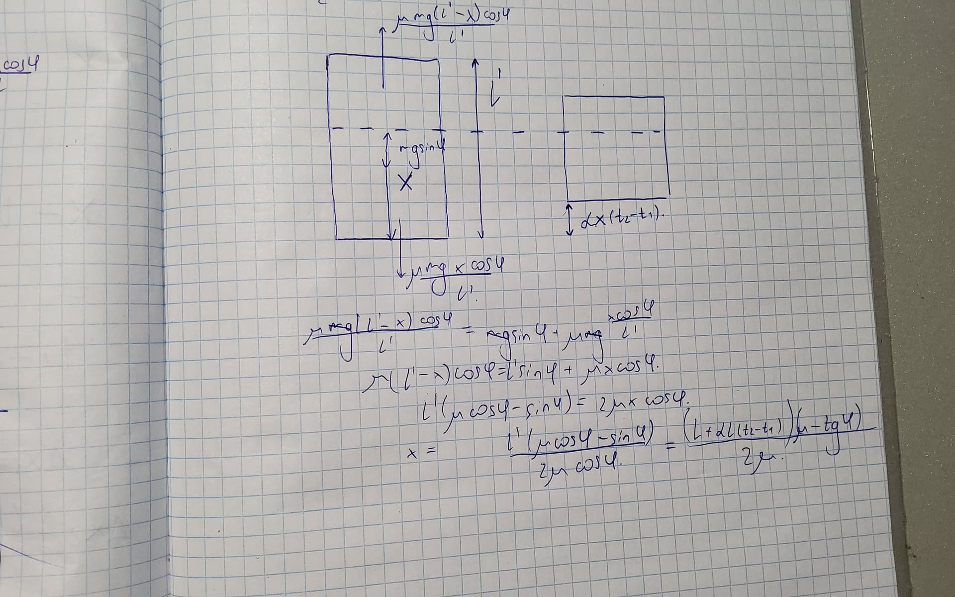 Смотри по вашему рисунку видно, что начальная длина всего до охлаждения некая l', потом в процессе очень долгого охлаждения лист будет сужаться в зависимости от температуры. Мы берем l' как начальную длину, так как расположение неподвижных точек в разных процессах находится в разных местах. Сила трения играет роль только некой “опоры” для листа, чтобы он не скатился с крыши, а в ином случае лист будет просто падать. Так что, тут нужно смотреть только относительно линейного расширения листа, а сам механизм линейного расширения основано на изменений начальных размеров какого либо тела в зависимости от его температуры.