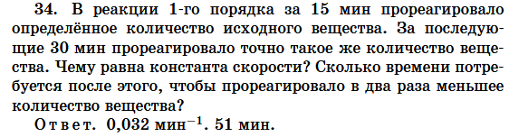 В реакции 1-го порядка за 15 мин прореагировало определённое количество исходного вещества. За последующие 30 мин прореагировало точно такое же количество вещества. Чему равна константа скорости? Сколько времени потребуется после этого, чтобы прореагировало в два раза меньшее количество вещества?