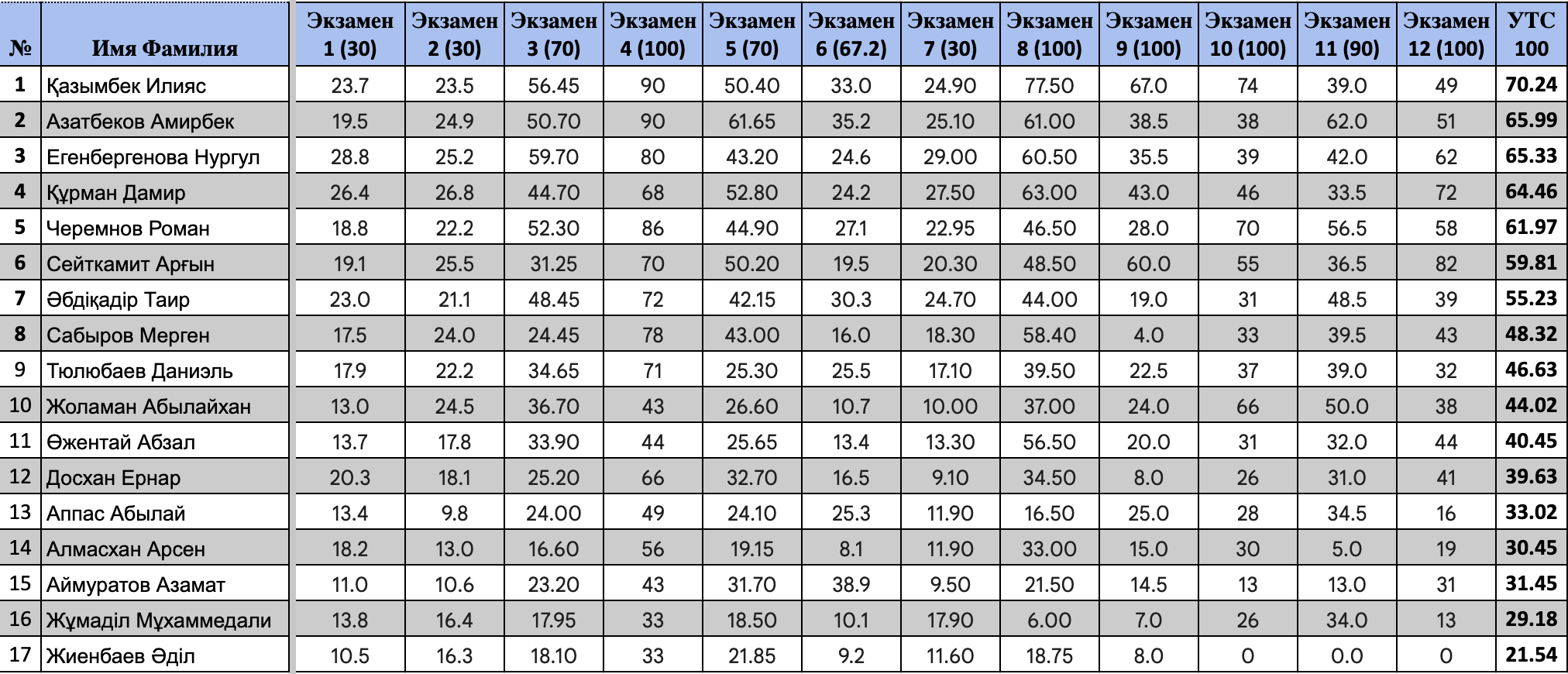 Сборы состояли из 12 экзаменов. Их результаты формируют итоговый рейтинг для попадания в сборные с долей 50% для APhO и 40% для IPhO соответственно.