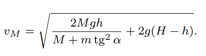 Тело массой m до отрыва проходит расстояние l=htg\alpha, а тело массой M проходит расстояние h. И не знаю что делать я пытался найти скорость просто приравнивая работу каждой силы на кинематическую энергию но не получилось. Правильно ли я все решаю?