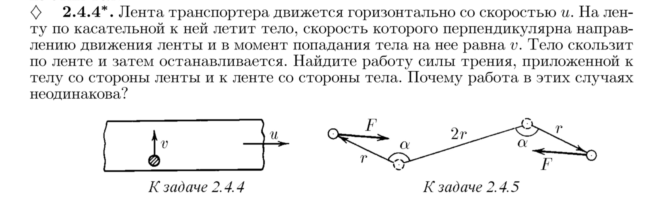 2.4.4*. Лента транспортера движется горизонтально со скоростью \ce u . На ленту по касательной к ней летит тело, скорость которого перпендикулярна направлению движения ленты и в момент попадания тела на нее равна \ce \nu . Тело скользит по ленте и затем останавливается. Найдите работу силы трения, приложенной к телу со стороны ленты и к ленте со стороны тела. Почему работа в этих случаях не одинакова?