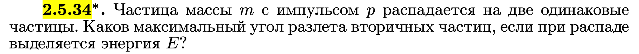 Частица массы m с импульсом p распадается на две одинаковые частицы. Каков максимальный угол разлета вторичных частиц, если при распаде выделяется энергия E?