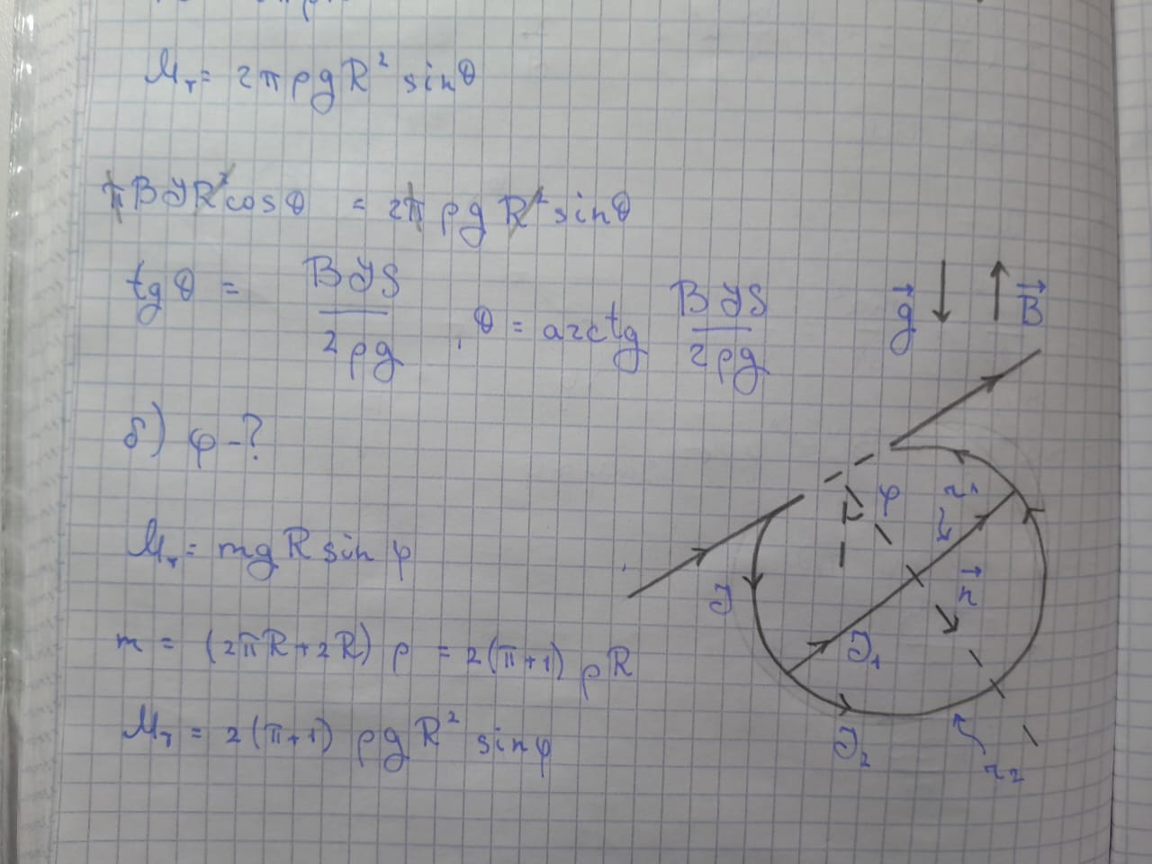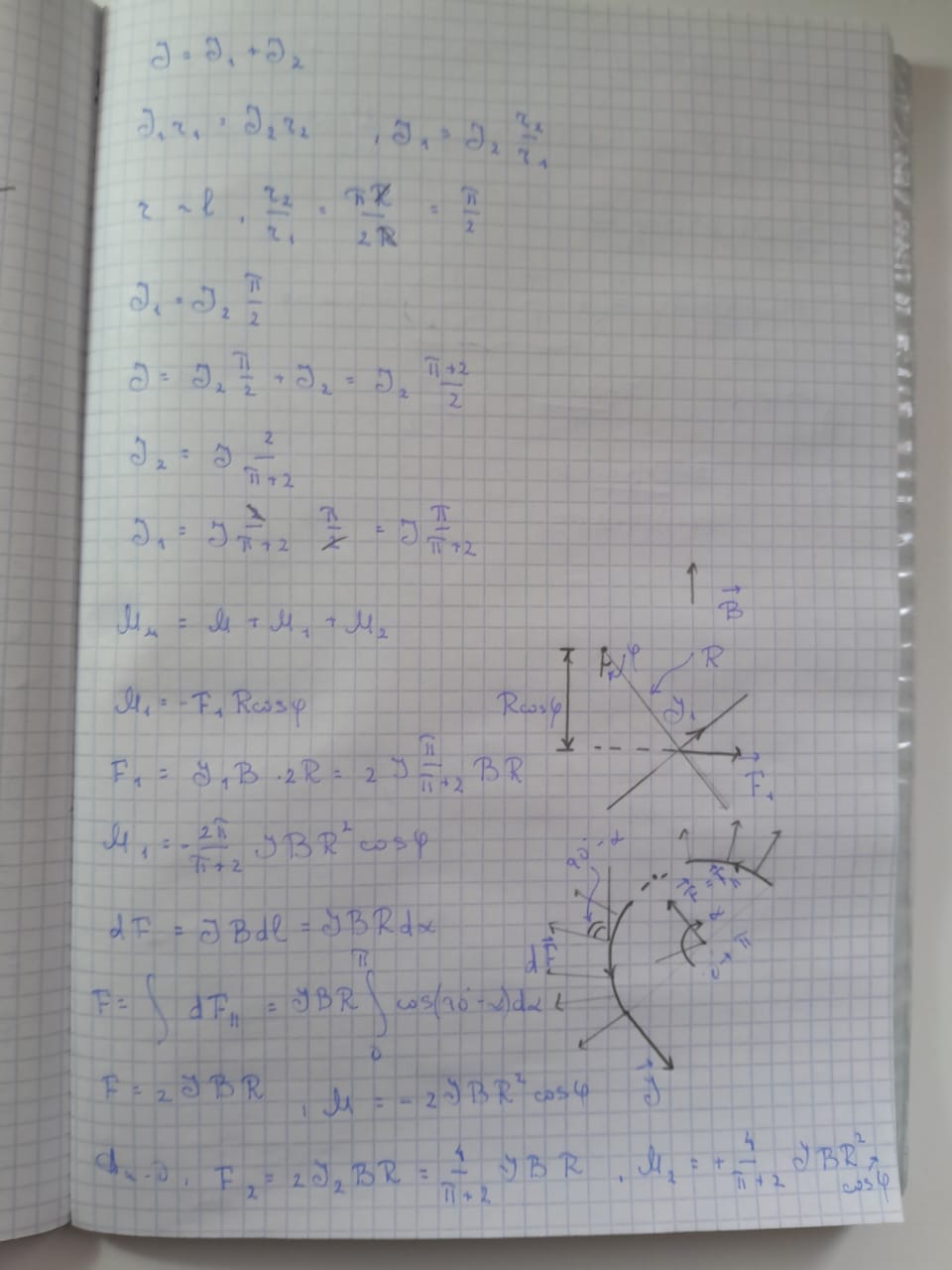 Короче как я понял, ты считал моменты на каждый кусок, что вообще говоря трудоёмко и скучно. Есть способ через магнитный момент. Ты разбиваешь контур на 2, ну условно возьмём первый контур это окружность, а второй это половина окружности которая за стержень держится. Находишь для каждого магнитный момент, векторно умножаешь на B и складываешь получившиеся величины. У тебя получится момент который действует на систему со стороны поля. Ну а дальше ты и сам знаешь.