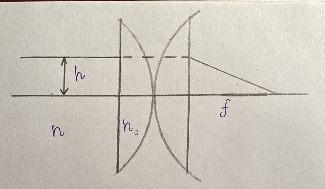 Возьмем луч на расстоянии \displaystyle h<<R параллельный опттической оси. Тогда его путь можно разложить на три части: внутри линз, между линзами и от линз до фокуса.