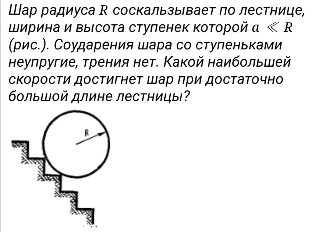 Шар радиуса R соскальзывает по лестнице, ширина и высота ступенек которой а «R (рис.). Соударения шара со ступеньками неупругие, трения нет. Какой наибольшей скорости достигнет шар при достаточно большой длине лестницы?
