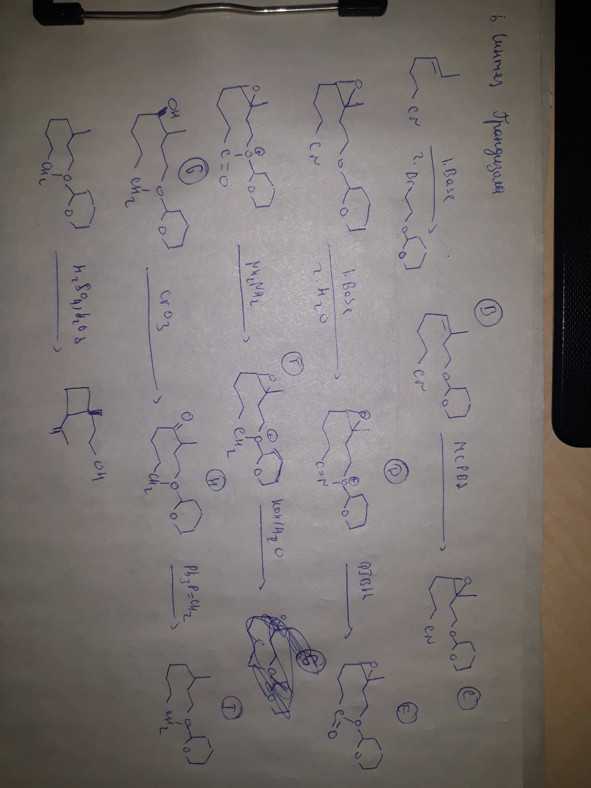 Первая стадия -это нуклеофильное замещение, движущая сила нитрил. Вторая реакция у тебя правильна. На третьей стадии происходит все тоже самое что и в первой, резонанс нитрила и вместо замещения происходит раскрытия эпоксида. В следующей стадии на самом деле не хватает щелочи в условие, но это не мешает нам заметить что изменения произошли -N, +OH, что соответствует образованию альдегида из нитрила. Далее в двух стадиях происходит удаление кислорода у альдегида. После чего окисление спирта, после реакция Виттига. И последняя стадия - удаление защитной группы.