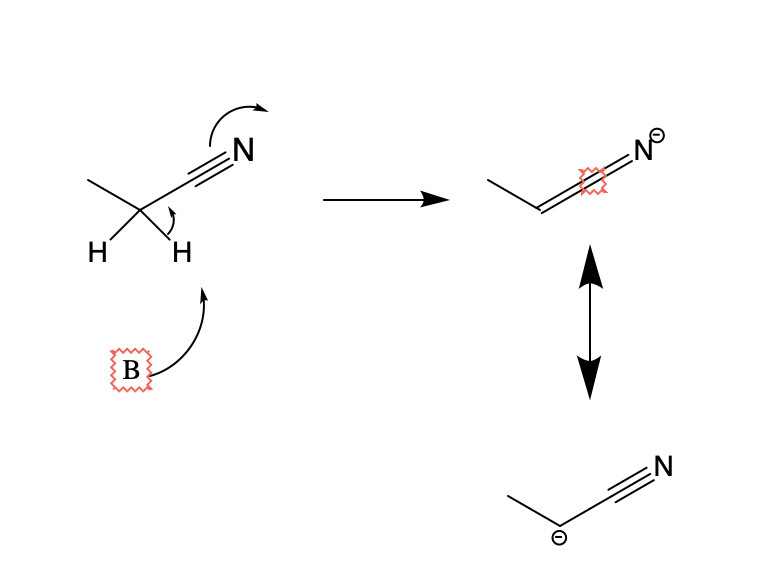 Для того чтобы первая реакция протекала так, как это нарисовали вы, основание должно отщеплять протон от sp^2 атома углерода. pKa этилена 44. pKa ацетонитрила 25.