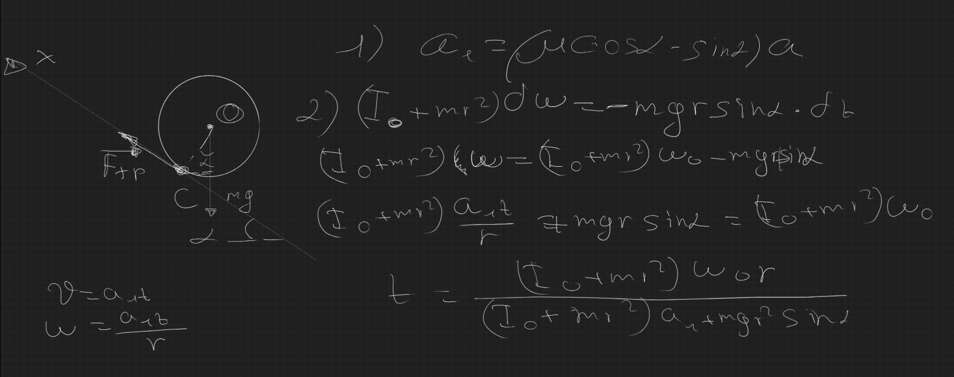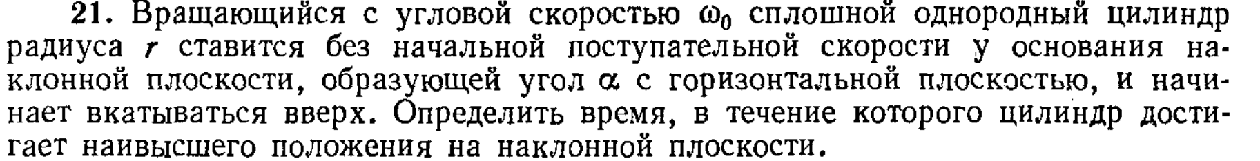 22. Считая в предыдущей задаче коэффициент трения скольжения k цилиндра о наклонную плоскость заданным и постоянным, определить: 1) ускорение цилиндра а1, когда качение происходит со скольжением; 2) время t1, по истечении которого наступает чистое качение; 3) высоту H1, которой достигает цилиндр, прежде чем начинается чистое качение; 4) ускорение а2 при чистом качении; 5) дополнительную высоту H3, на которую поднимется цилиндр при чистом качении; 6) полную высоту поднятия Н; 7) время обратного скатывания цилиндра т.